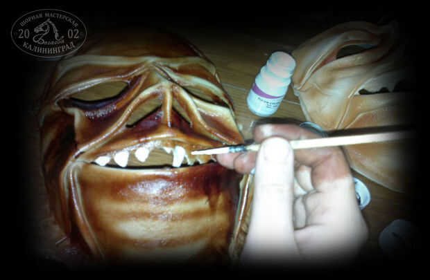 Pintura de la cartilla con alcohol. Uso de Polonia - Kaps. Pero puede utilizar cualquier pintura de la cartilla de alcohol lo que puede absorber en la piel. No usar pintura base agua - no sé cómo puedo usarlo. Que un maquillaje de la boca - que necesitamos pintar los dientes con la pintura de acabado en blanco (si la máscara no es blanca como en la foto)
