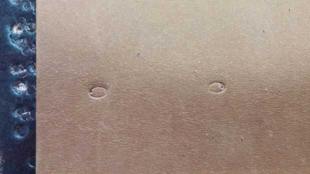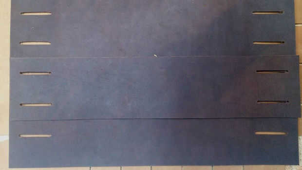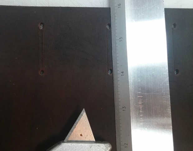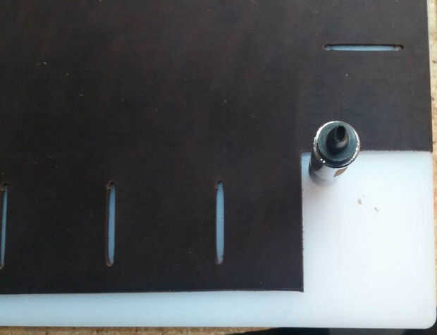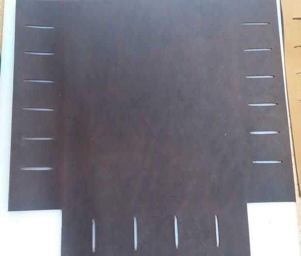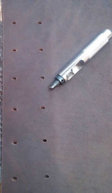 Los pequeños agujeros en la plantilla para las ranuras son 1.5" aparte, por lo que cuando el agujero de perforación Asegúrese de configurar el edge del golpe en cada hoyo marcado en el cuero por lo que sus ranuras terminan siendo 1.5" de largo. Ver fotos de primer plano detalle.