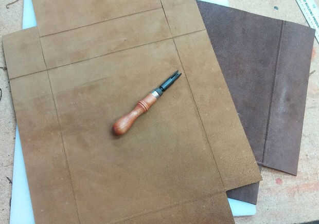 Para facilitar los lados inferior y doblar las aletas delanteras al montar el satchel, usé una gubia "V" regulable para cortar ranuras donde se harán los dobleces. Ajustar la gubia para retirar aproximadamente 1/3 del espesor de la piel. Una arista o una costura beveler podría utilizarse también para hacer estas ranuras.