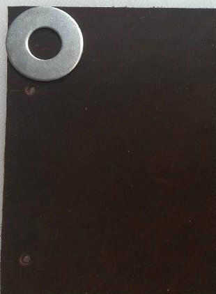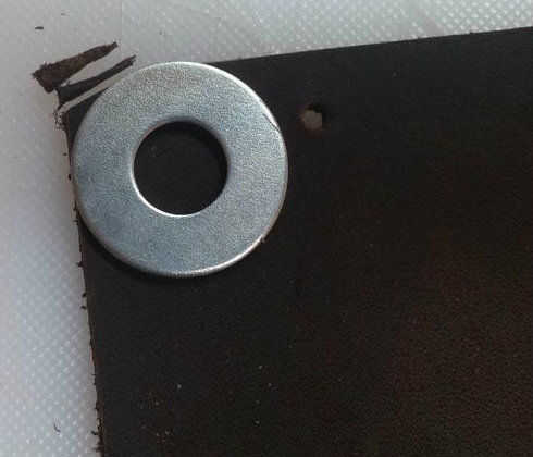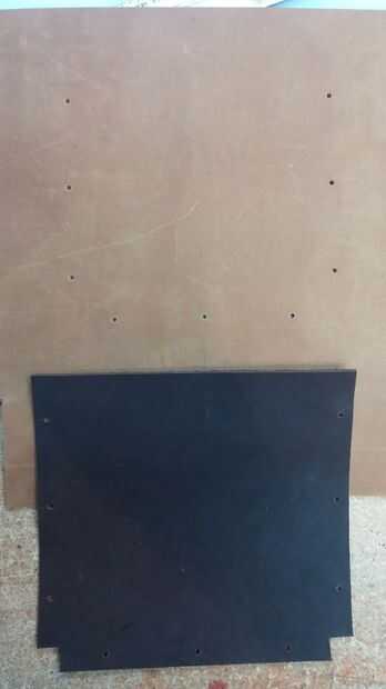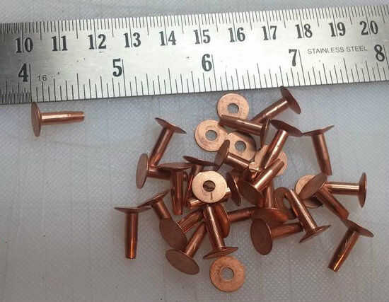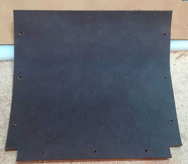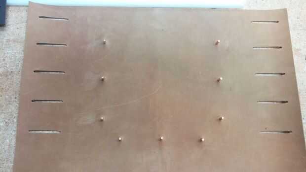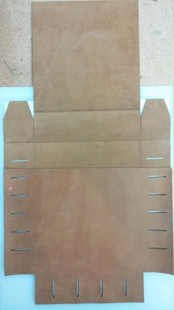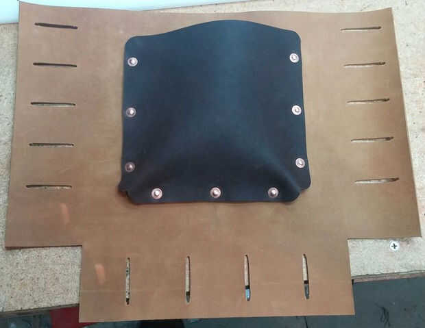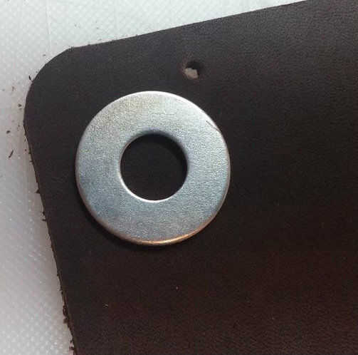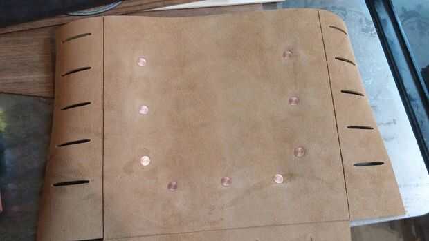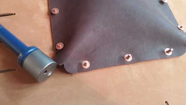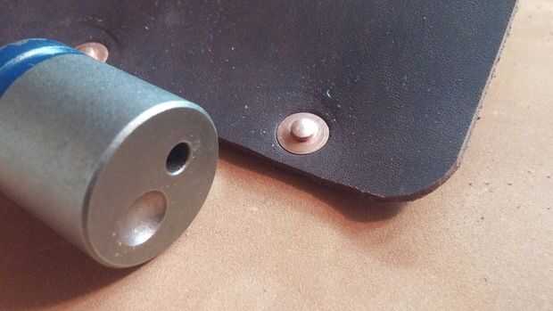 Colocar el bolsillo en el divisor, utilicé 1/2" remaches cobre del calibre 12 con rebabas, pero puede utilizar cualquier tipo de remache que usted desea. O podría coser el bolsillo al divisor... Creo que remaches de cobre son cool y divertido de usar. Además se desarrollará una gran pátina con el tiempo. Aquí está un rápido 2 minutos de video que muestra cómo establecer remaches de cobre.