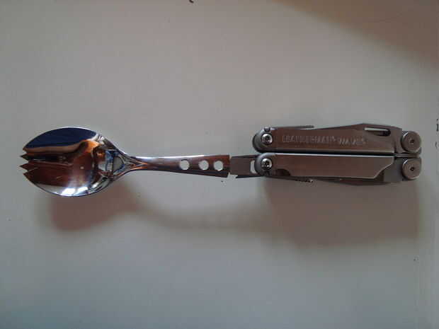 Un algum tempo atrás, ví o capaz de como fazer talheres para o (fabuloso) Leatherman Wave. Como o meu onda é do modelo novo, resolvi fazer um novo talher, juntando garfo e colher resultando num spork (cuchara + tenedor) adicionando algumas servicio.