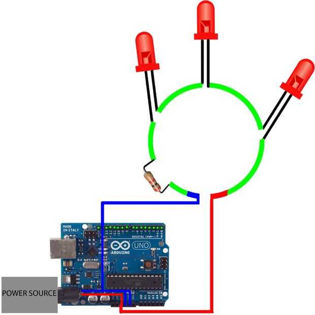 Puesto que el diagrama anterior, podría ser un poco confuso para algunos, he tomado el tiempo para hacer un diagrama en el formato que todos conoce y ama. En términos simples, el pin de 5V (el poder) se conecta con el extremo largo del primer LED, que conecta su pata corta pata larga del segundo LED, que hace lo mismo para el tercer LED. El tercer LED, luego se conecta la pata corta a la resistencia (que permite que la electricidad fluya sin quemar los LEDs) que luego se conecta a la Arduino gnd. Es que los LEDs están conectados directamente a la Arduino que está conectado a una batería, todos ellos deberían iluminarse!