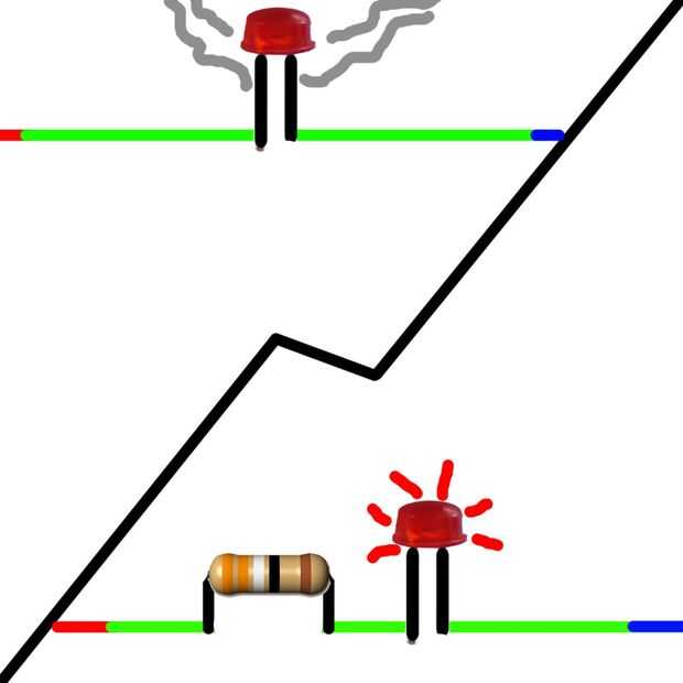 En el diagrama donde la resistencia no está presente, vemos que el led se quema, incapaces de tomar la corriente grande dada de la fuente de alimentación (la batería está ahí, pero es representada como la tierra y el poder). Sin embargo, al insertar una resistencia en el circuito, el led brilla sin quemar. La razón: porque existe el resistor para reducir la cantidad de corriente que fluye por el circuito. Hay una fórmula, llamada ley de Ohm (después de un alemán físico Ohm), que describe este fenómeno matemáticamente. Corriente = voltaje/resistencia.