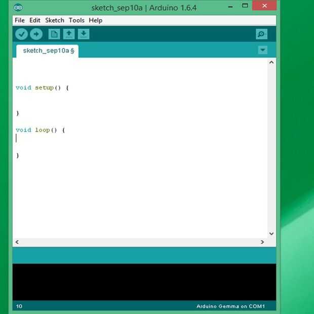 Suponiendo que has descargado la actualización más reciente de la aplicación de Arduino (versión 1.6.4, para los interesados), obtendrás una ventana que se parece a la imagen que se muestra cuando se abre.