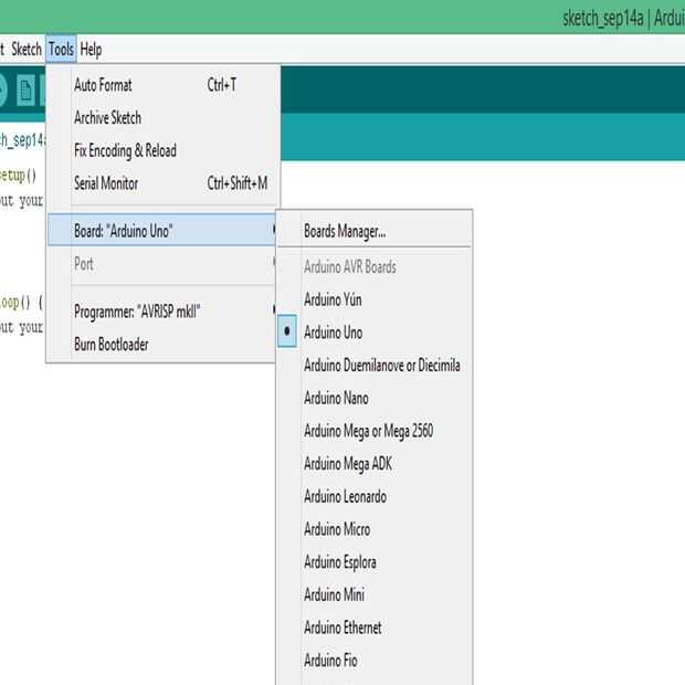 Cuando subes tu código para el arduino, asegúrese de que tener un USB conectado a tu arduino. A continuación, compruebe que el equipo sabe qué tipo de arduino es 'hablar' a. Para ello, vaya a la pestaña en la ventana selectivo «herramientas». Al hacer clic en él, mirar el menú y asegúrese de que ver "tablero de Arduino Uno", como se ve en la primera imagen.