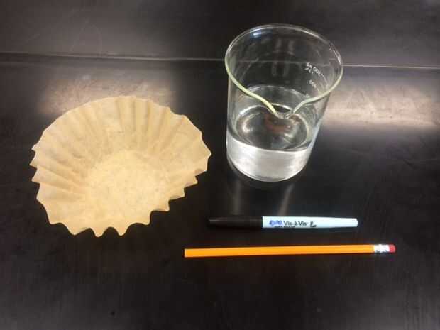 Paso 1: Reunir los materiales necesarios (filtro de café, lápiz, vaso, lápiz/marcador de soluble en agua, agua)