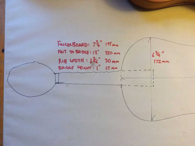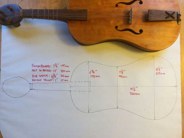 Seguí a luthería básico técnica haciendo que el cuerpo. Las costillas fueron vapor doblado alrededor de un molde y reforzado con tiras delgadas de madera a lo largo de los bordes que se pegan al cuerpo y espalda. El mismo molde se utilizó como plantilla para cortar el vientre y espalda, con un traslapo de unos 2mm alrededor. Las costillas son muy delgadas, de unos 2mm.