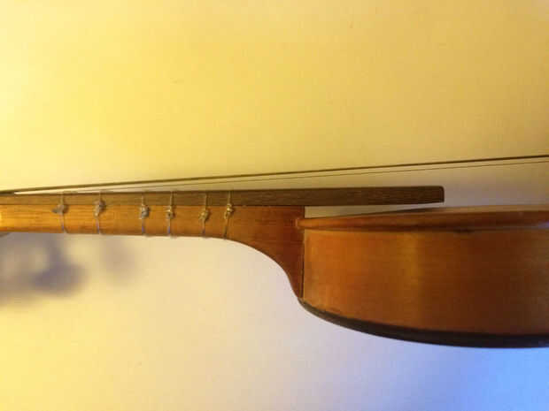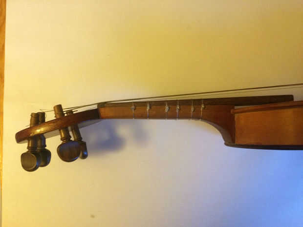 La vielle tiene un ángulo menos pronunciado de cuello que un violín moderno. Además, el cuello se ata tradicionalmente con un tornillo o clavos en el cuerpo, pero usé una mortaja y espiga común como un violín. Después de algunos años, este conjunto vino suelto, como se aprecia en el cierre para arriba. Lo reajuste implicaría quitar el vientre y reencolado.