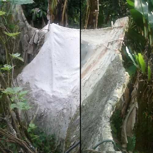 Esta pared está hecha de cemento y malla de nylon. Aunque sólo aproximadamente 1/8 pulgada de espesor en muchos lugares, de alguna manera ha logrado sobrevivir los huracanes. Probablemente puede crédito a su forma irregular, que incluye una línea serpentina de la Fundación. Es la naturaleza del cemento del encogimiento y grietas, aunque. Cuando un plátano planta y pesado en forma de racimo de banano cayó en él, no la pared y rompió una gran parte de ella.