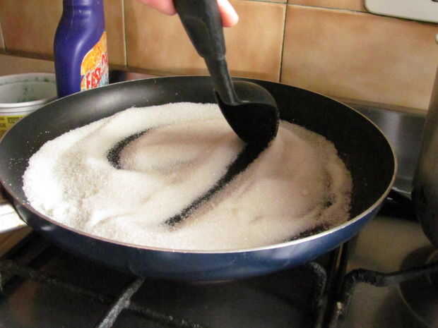 Poner 1 taza de azúcar en la sartén, a fuego alto hasta que se funda, mover con una cuchara para que no se queme