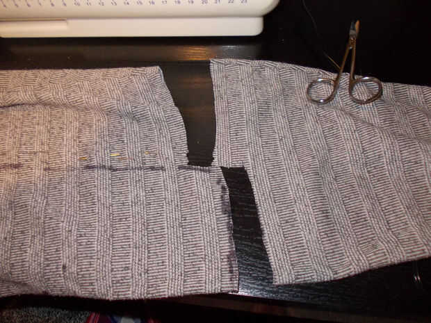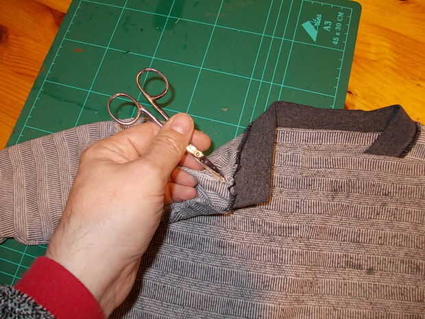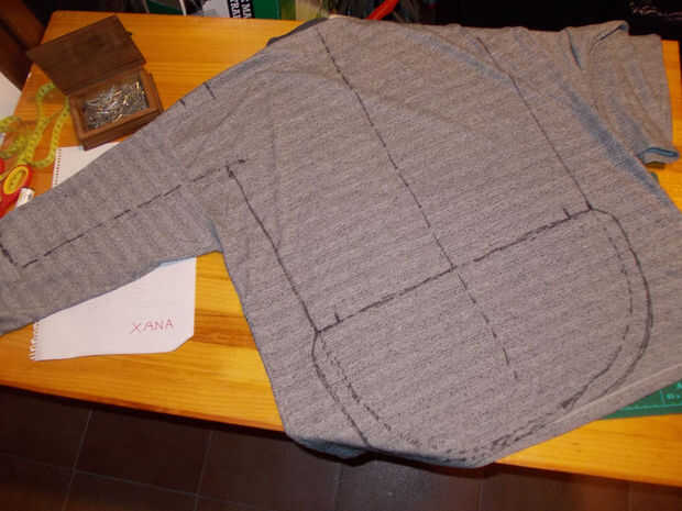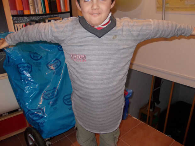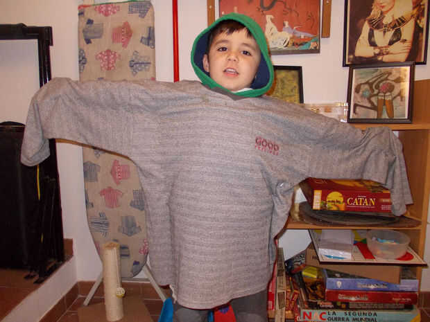 Una vez puesto al niño y tomadas las medidas con alfileres, cosí el pijama para ajustar-lo a la forma de túnica deseada. Una vez cosida, recorté la tela sobrante.