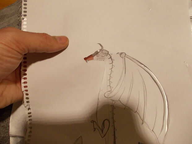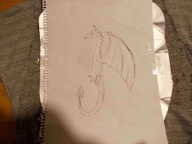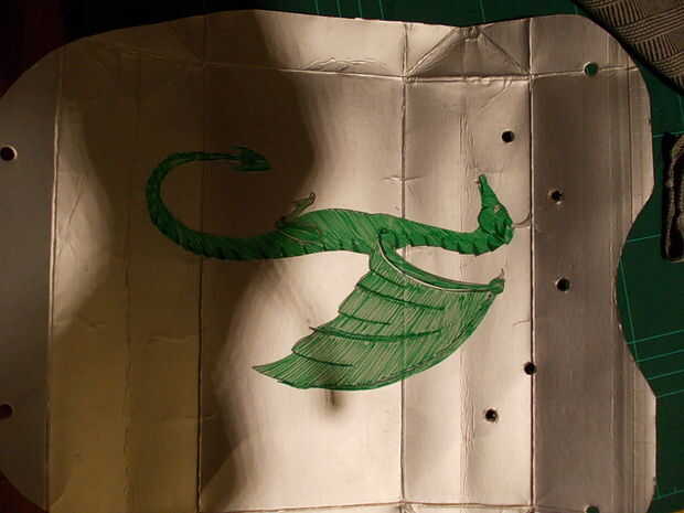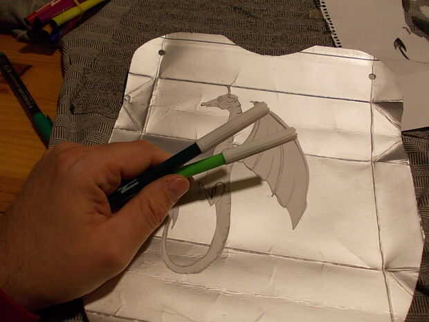 Pinté el dragón con rotuladores, y una vez seco le dí una capa de barniz para que no se despegara muy rápidamente (cosa acabó ocurriendo, pero después de un día y medio. de uso...).