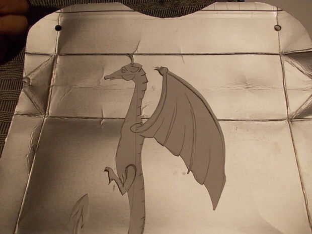 Para el peto, recorté una placa entera de tetrabrik redondeando un poco los cantos. A esta pieza, le enganche el dragón de papel sobró de calcar-lo al escudo.