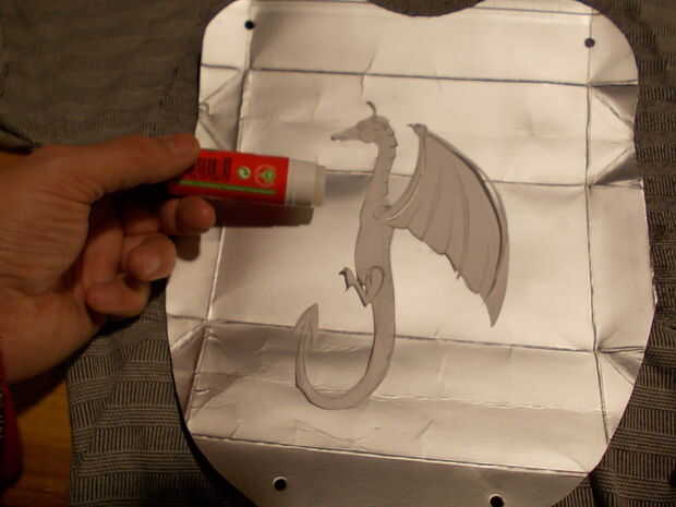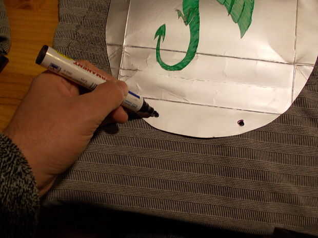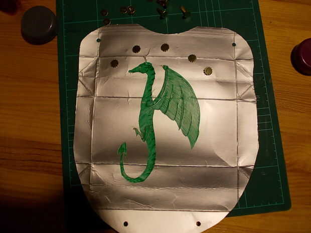 Pegue el dragón de papel utilizado como patrón para la pintura del escudo. Pintar este Dragón con marcadores verdes y revestido con el mismo barniz utilizado para el blindaje. Con esta capa de barniz trato de evitar la caída del dragón. Me he conseguido este desafío del dragón sin caer... sólo por un día...