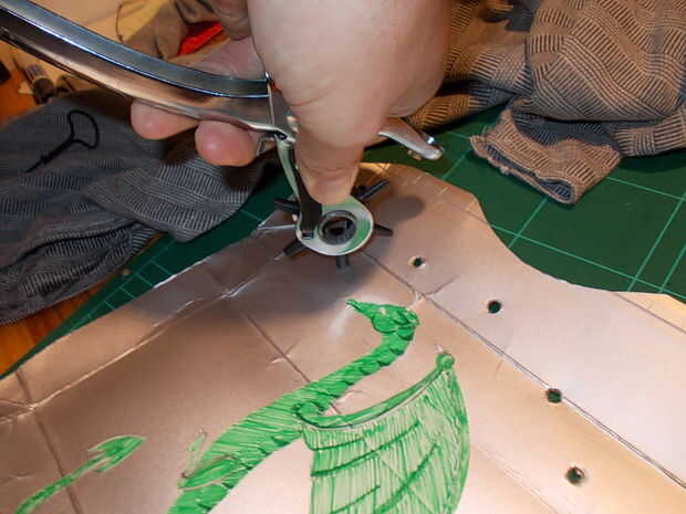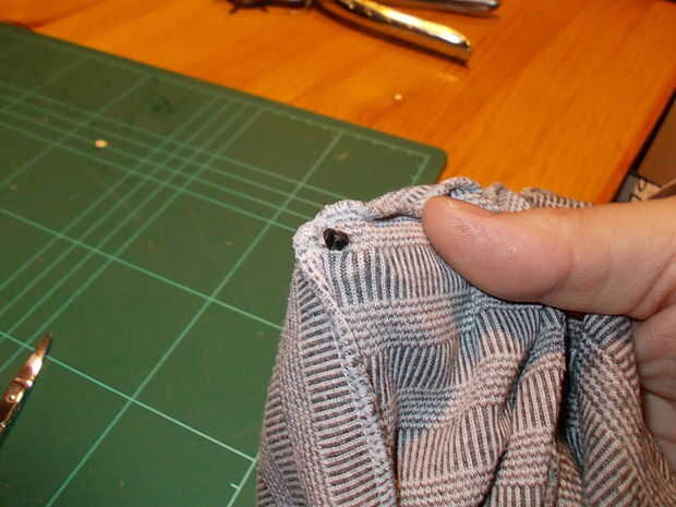 Le quité la túnica al niño y con las tijeras de costura agujereé la tela y fui fijando las distintas piezas de apoyadas con remaches y el pegamento instantáneo.