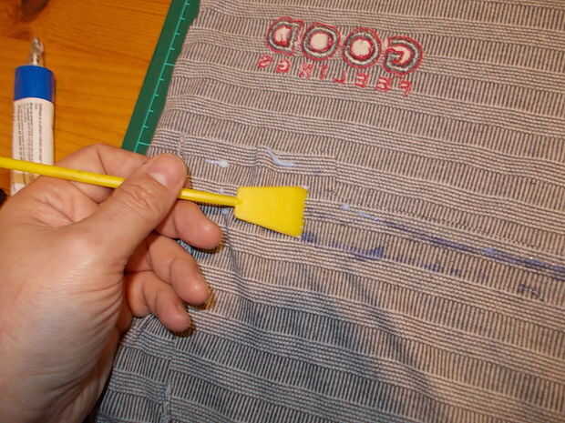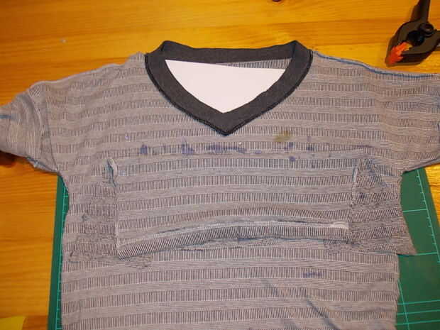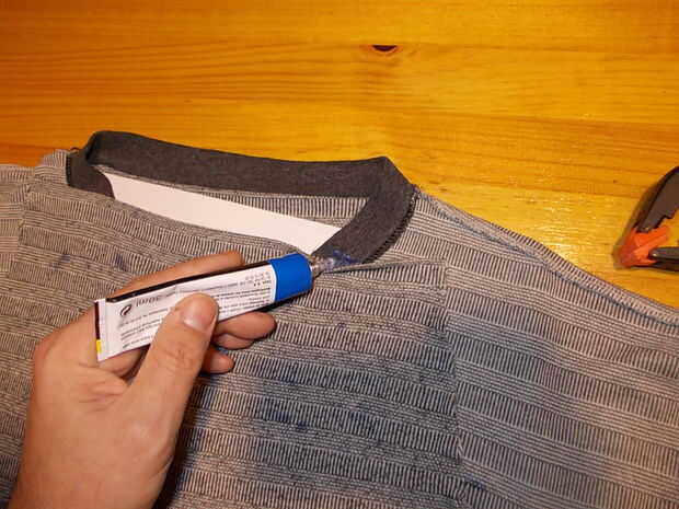 Probando me di cuenta sobre el cuello es demasiado abierto, sin protección. Para solucionar esto, fije que un trozo de tela. Cansado a la batalla contra mi máquina de coser cutre, decidir unir esta pieza con un especial para el pegamento de tejidos.