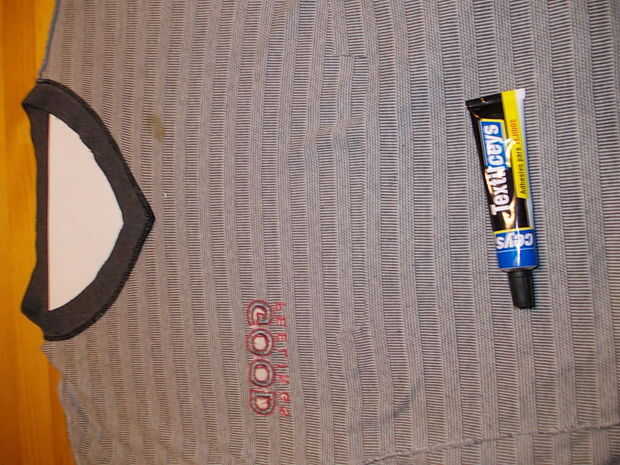 Cómo vi una vez puesta le quedaba un cuello demasiado ancho y se cuenta el logotipo del pijama, le pegué uno de los retales sobrantes de ajustar la túnica en el pecho y cuello. Para no volver a pelearme con la máquina y por falta de tiempo, usé un adhesivo especial para telas es el uso para arreglarle al niño las rodilleras se le despegan.