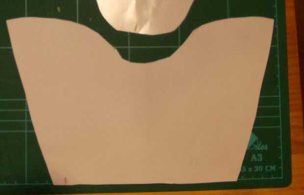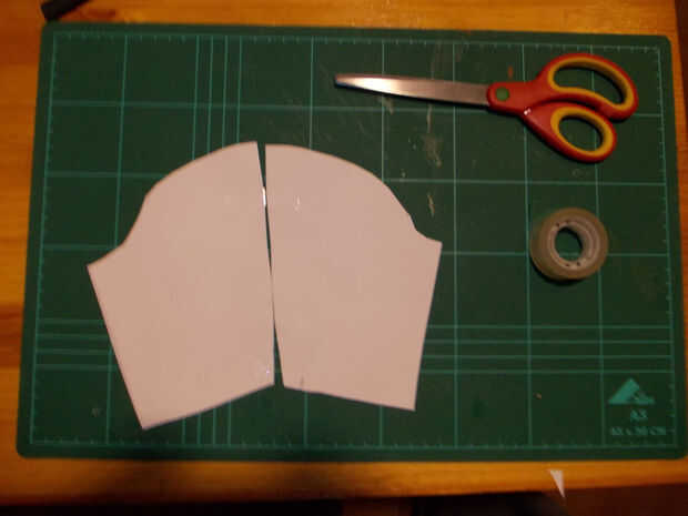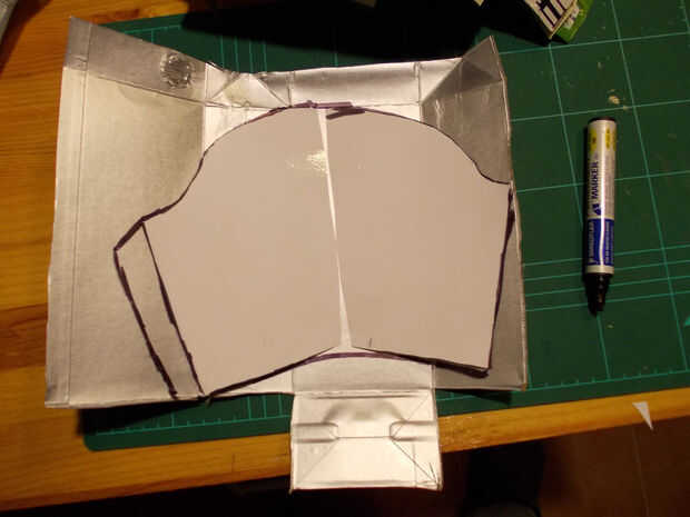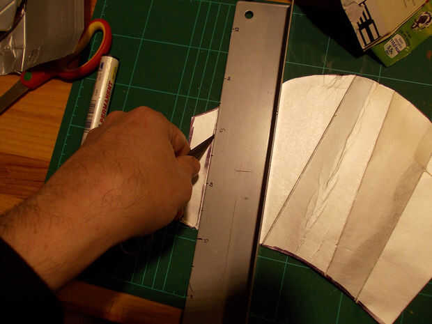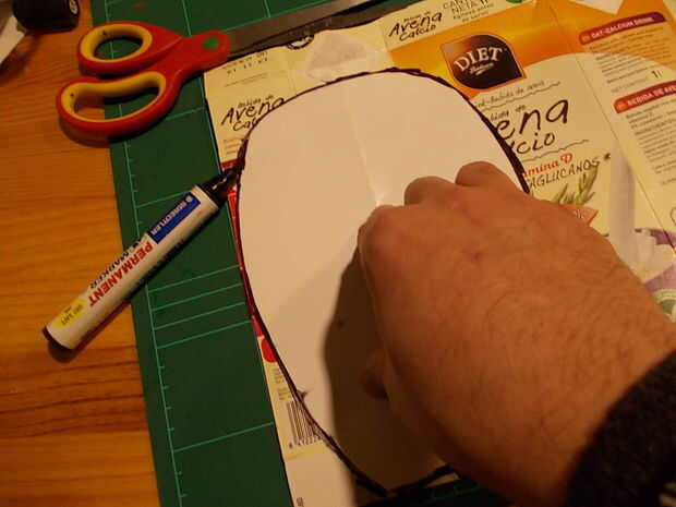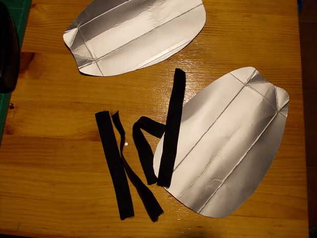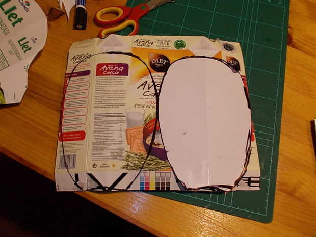Para las grebas, volví a tomar medidas con papel, recortar, adaptar, marcar y recortar el tetrabrik una pieza en forma de lágrima con la parte inferior recortada en forma de media luna. Una pieza de esta, por la parte interior, le pegué con grapas y cola de contacto dos tiras de cinta elástica para fijarlas a las espinillas como si de un calcetín se tratase.