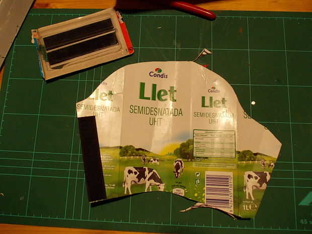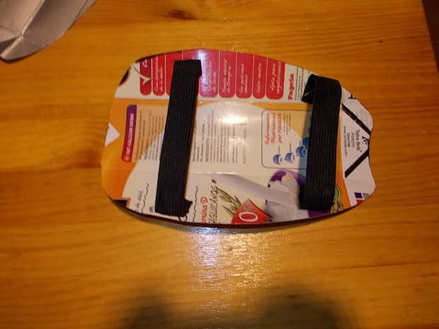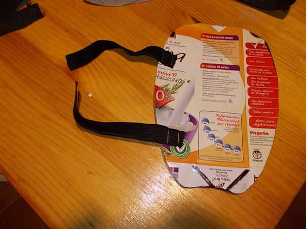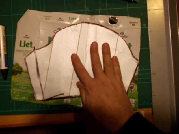 Para chicharrones, una vez más con el patrón de papel hacer un corte como rasgón forma en un trozo de cartón de leche y en la parte interior ataré con pegamento y grapas dos elásticos frotadores para permitir este greaves vestir como si ellos donde calcetines.