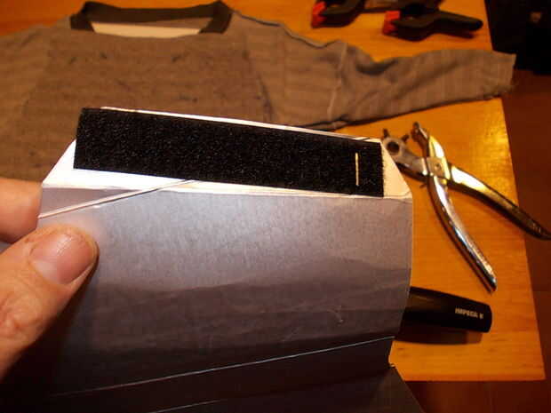 En uno de los lados internos y en el opuesto lado externo que he pegado tiras de velcro para permitir abrir y cerrar este brazales. Para evitar este velcro barato sale, asegure con unas grapas. La próxima vez comprar velcro sin pegamento y pegar con pegamento de contacto, estoy seguro de que esto será más resistente...