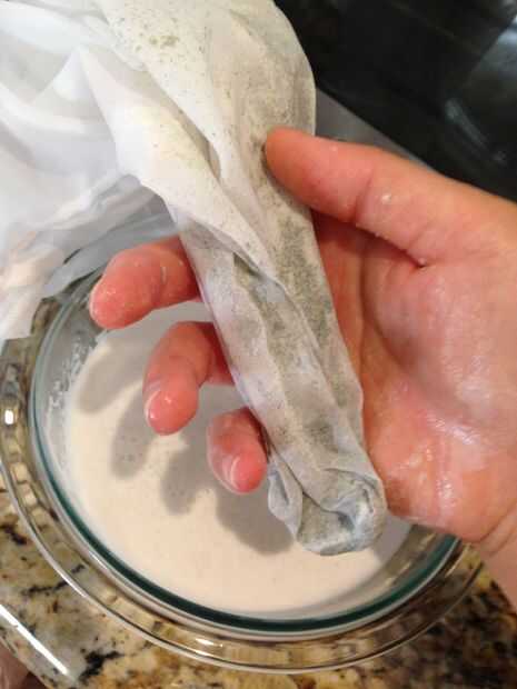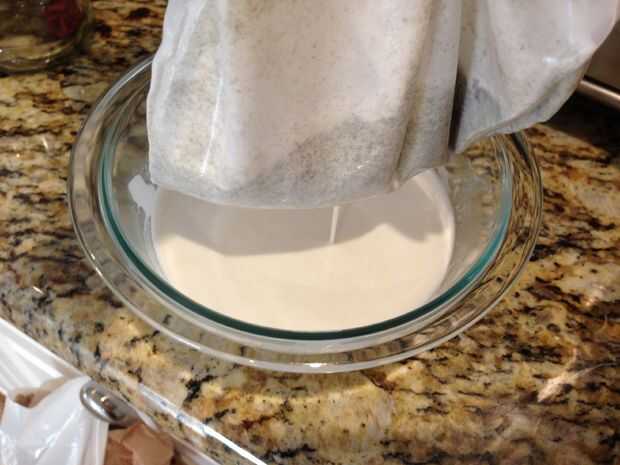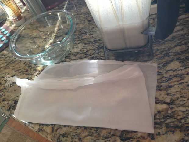 Si desea una leche suave, luego coloque la bolsa de estopilla o leche en el recipiente y vierta la leche.