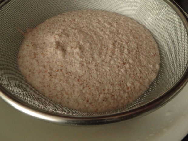 Mezcla de maní con 3/4 agua hasta que quede suave. Filtrar en un recipiente. Mezcla de maní molido húmedo una vez más con agua de 1/4 izquierda. Filtrarla.