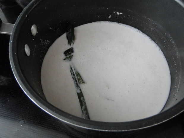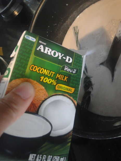 Cuando comience a hervir, verter en una taza de leche o crema o leche de coco y algunos pedazos de azúcar de la roca.