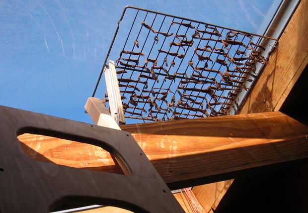Después de un intervalo decente puse la rejilla en el tragaluz como se ve aquí. Unos días más tarde cuando volví estaba todo feo y delicioso. Woohoo! Tradicional cecina accionado solar!