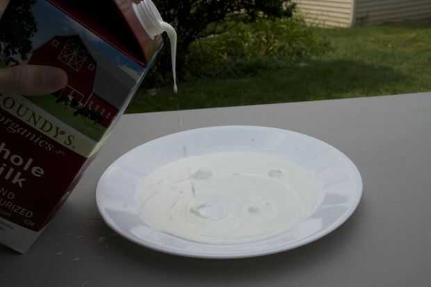 No necesita mucho a todos. Se hará sólo una fina capa de leche. Porque no es necesario tan poco leche derramé mina en una placa con bordes levantados en vez de un tazón de fuente mucho más profunda.
