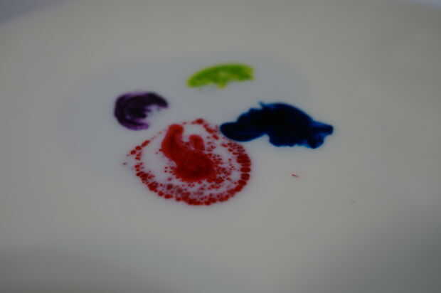 Ahora usted puede bajar a la diversión cosas! Comencé agregando cuatro o cinco gotas de púrpura, rojo, verde y azul en el centro de la placa. Pero como dije en un paso anterior: puede utilizar cualquier color que usted desea. Diviértete colocando diferentes números de gotas en diferentes áreas de la placa para ver qué va a pasar.