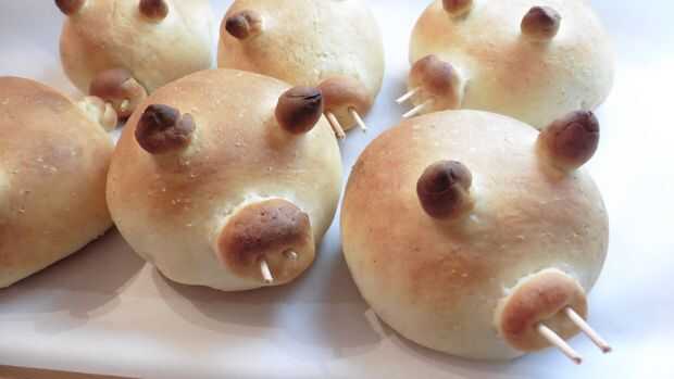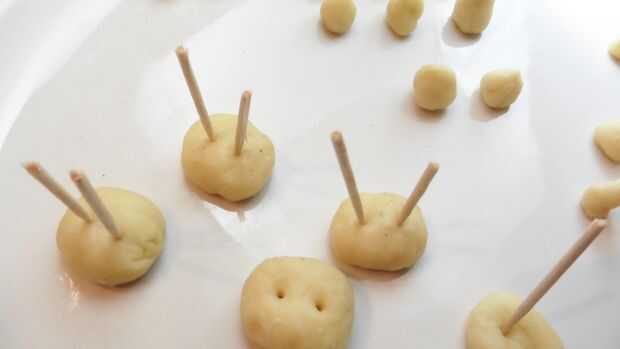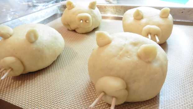 2. Aplanar en un óvalo y lo pega con 2 mondadientes o 1 palillo roto por la mitad. Conéctelo a la parte frontal de la bollo donde debe estar el hocico.