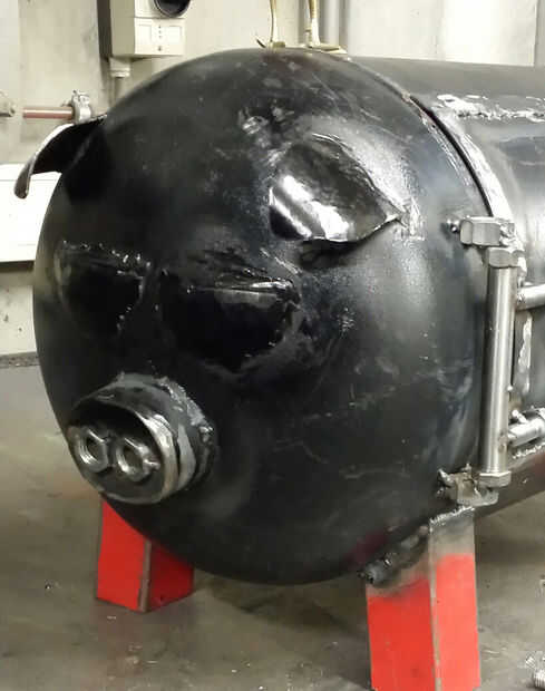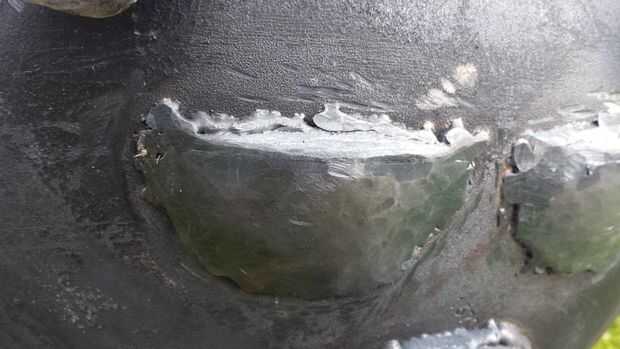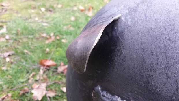 Los ojos son hechos por trabajarse una pieza redonda de chapa de acero en frío. Utilizando una amoladora angular la placa fue cortada por la mitad y soldada a la botella.
