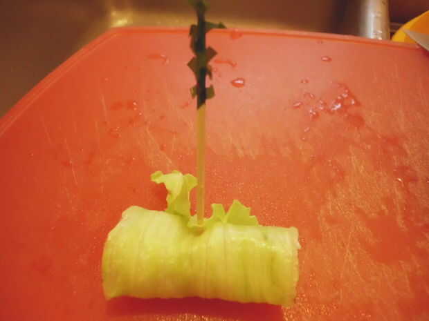 Rollo de una sola pieza de relleno con un trozo de lechuga. Utilice un palillo de dientes para mantener la lechuga en su lugar.