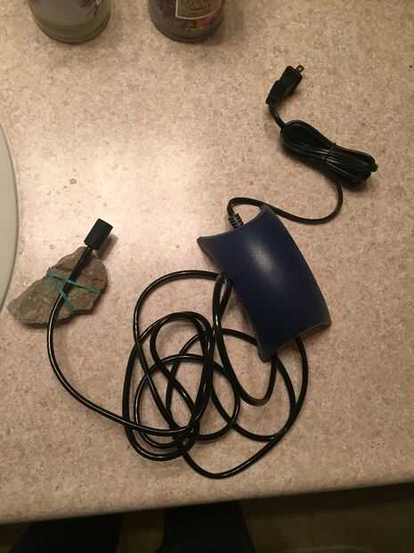 - Conecte la bomba de aire, tubo de aire y aire de piedra. Ponga la piedra de aire y algo de aire del tubo por el agujero que ha perforado. Que tenga peso la piedra del aire de alguna manera para impedir que flotando. He utilizado la goma y una roca.