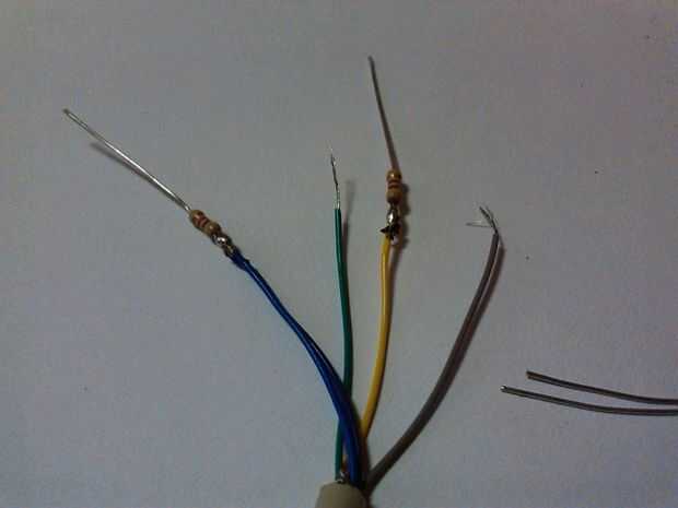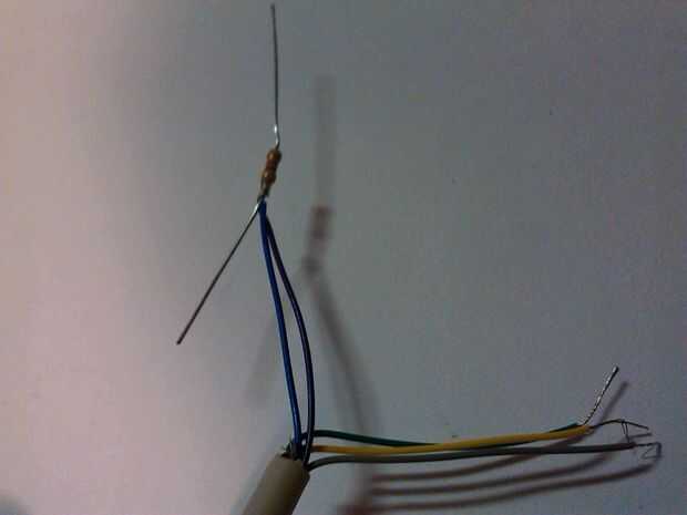 Comenzamos soldando juntos (en mi caso) los cables azul y púrpura y también añadiendo una parte de una resistencia. Te queremos hacer lo mismo con el cable amarillo así como. Envuelve los cables alrededor de una pierna y comenzó a soldar primero y cortar el resto. A continuación te suelde al otro lado de la resistencia en el cable amarillo al cable gris sin quitar el resto de la pierna.