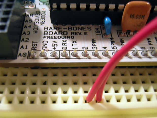 Como usted probablemente lo adivinó, conecte Vcc a + 5V y Gnd a tierra. Porque el lector de RFID consume tanta energía, pueden bang el pin ENABLE para apagar y encender en los varios intervalos. Simplemente decidió mantenerla. Debido a está invertido, tire bajo para activarlo. Alternativamente, usted puede conectar a tierra. Me conectado a PIND3 que me den opciones de activación/desactivación si decidí. El pin de salida es donde el lector envía sus datos seriales después lee una etiqueta. Me conectado a PIND2.