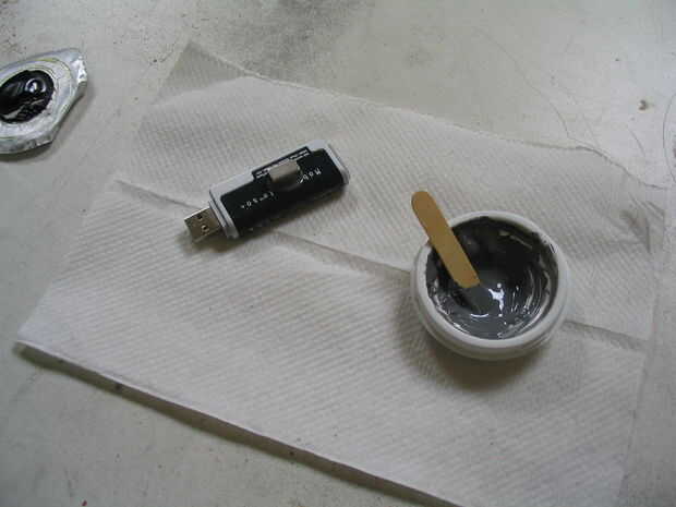 Abrir la caja de plástico estúpido del lector USB (esto es probablemente la parte más difícil del Instructable todo). Mezclar el epoxi y el pegamento en el imán.