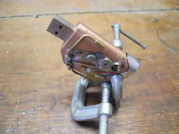 Éste me no dio ningún problema hasta que llegó a los puertos de latón para el led. Luego me dio todo tipo de dolor. Atribuyo esto a la matidez de los bits prestados que estaba usando. El flash drive Nintendo fue hecha usando bits nuevo que había comprado poco antes mientras que éste fue creado usando brocas 20 + años de edad en la tienda de mi padre. (debido a algunos problemas de plomería que no pude utilizar mi propio taller) Nota para los constructores posibles: Asegúrese que las brocas están afiladas para que no deslice alrededor y comer los lados del tubo de latón con cuidado corte.