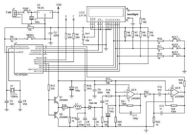 La parte principal es el popular microcontrolador PIC16F628A.