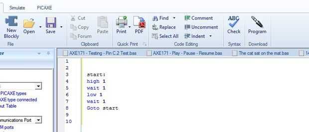 Entrada del programa en el editor como antes y descargar para el Picaxe 08M 2 chip.