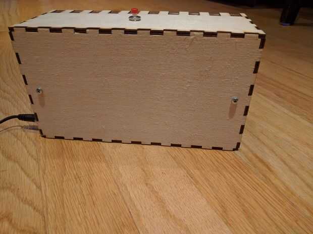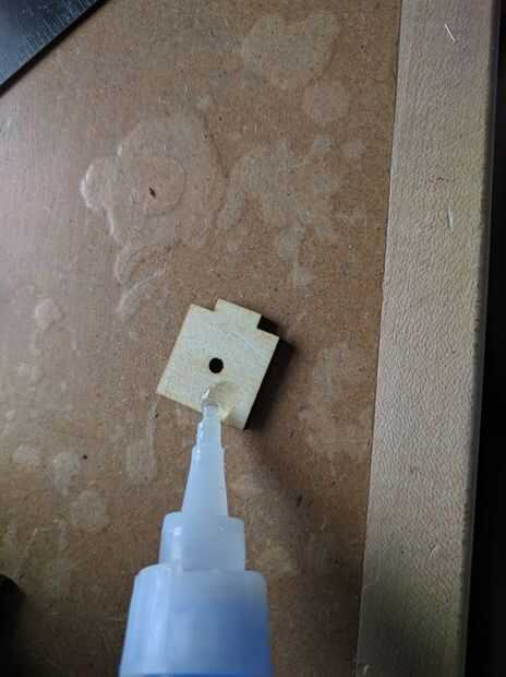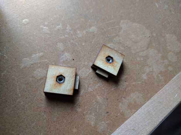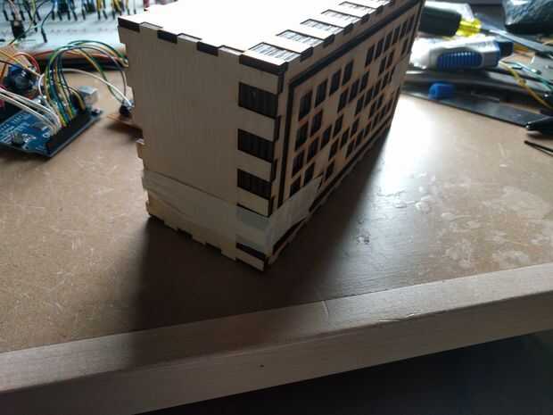 Una vez que estés seguro de que todo está funcionando, es hora de montar la caja y asegure la electrónica interior. Utilizando pegamento u otro pegamento de madera comparable, montar la estructura, utilizando los cuadros como dirección, asegurándose de que los dientes enganchen correctamente y que todas las caras son cuadradas entre sí. Como se muestra en las fotos, puede que necesite temporalmente los lados juntos para sujetar mientras se está secando el pegamento de la cinta. Luego construir el mecanismo de cierre, pegar los dos conjuntos de pequeñas plazas, asegurándose de que se alineen los orificios de pernos y tuercas. Cuando inserte las tuercas hexagonales en sus agujeros, puede pegar abajo si lo desea, sin embargo he encontrado que los agujeros eran lo suficientemente apretados como para simplemente fricción ajuste las tuercas en su lugar. Después de que se han reunido las piezas de fijación pegarlos a los lados más cortos del marco, en el surco más profundo para ellos. El hexágono-agujero-lados deben estar mirando hacia la cara del reloj. De nuevo, utilice los cuadros de asistencia.