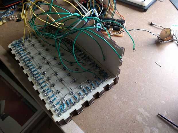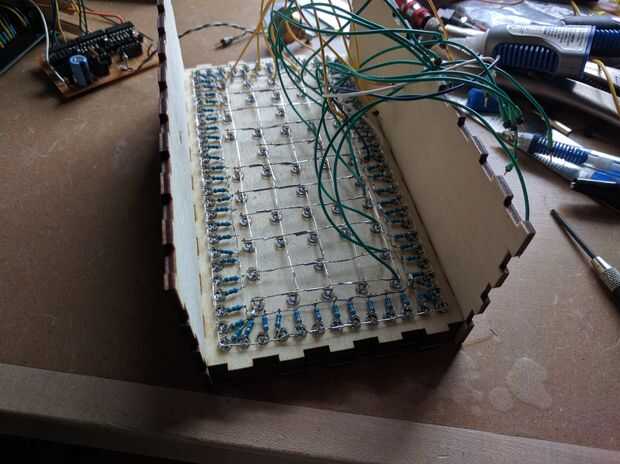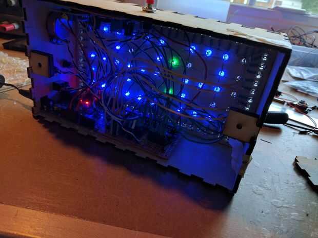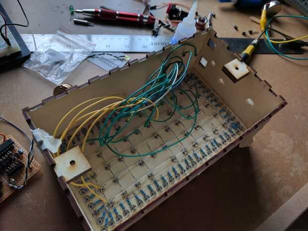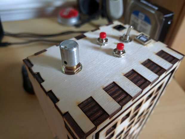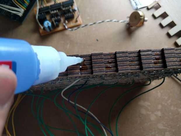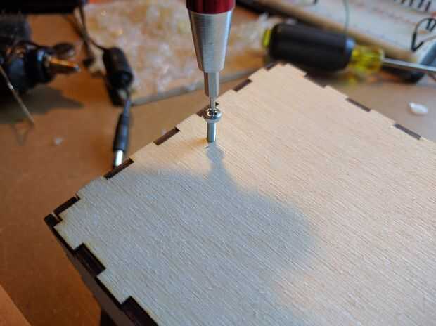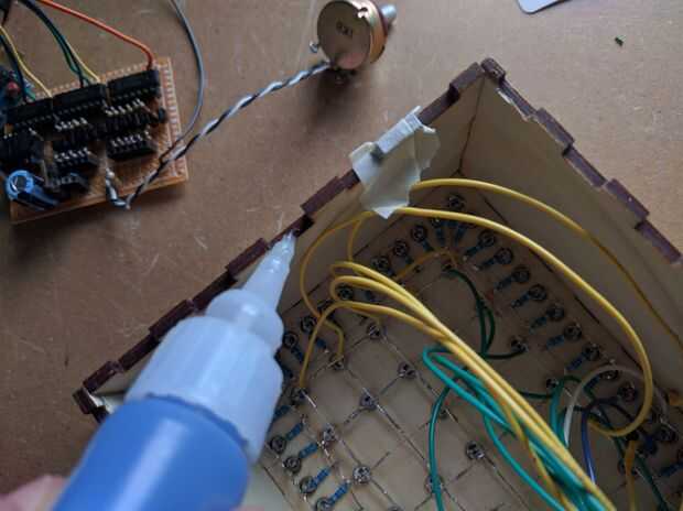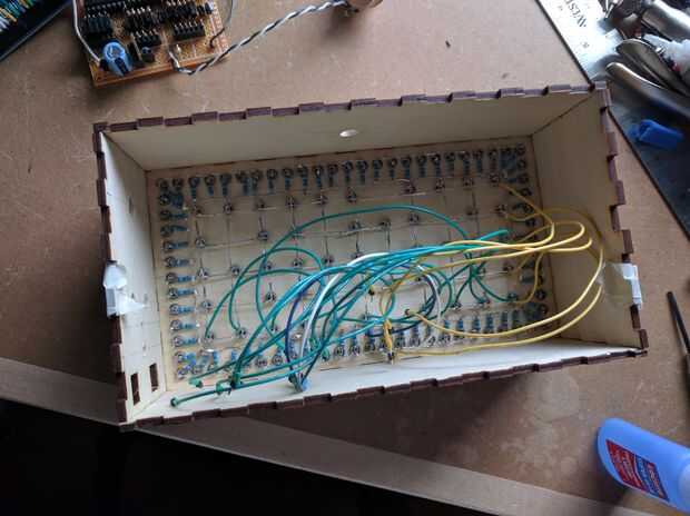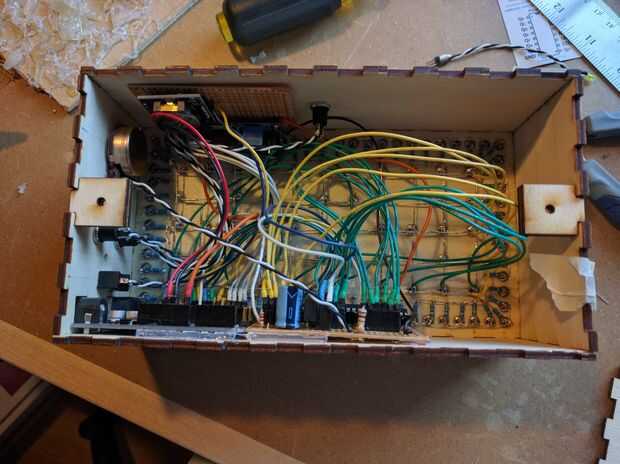 Ahora fije el circuit board(s) a la estructura. Quería montar más "profesionalmente" con tornillos, sin embargo encontré que pegamento caliente era simplemente mucho más fácil de usar. Luego enroscar todos los interruptores y el potenciómetro en sus respectivos agujeros e Inserte los cables en los pines de Arduino. En este punto debe ser terminado, y todo lo que queda por hacer es probar todo una vez más y cerrar la caja con los tornillos M3.
