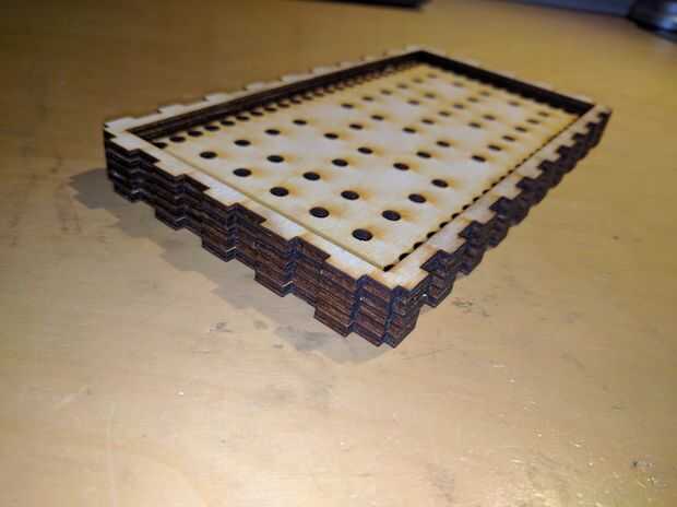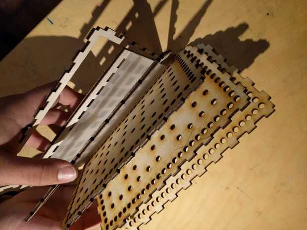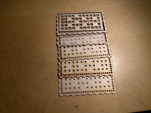 Luego montar la fachada del reloj. Utiliza las fotos como una referencia a pegamento cada capa juntos Iin el orden correcto, excepto el plexiglás y rejilla frontal de momento (estos se ser pegados sobre más adelante en el proceso de montaje). Montaje parcialmente algunas de las piezas de lado puede ayudar con el alineamiento, como se muestra en las fotos.