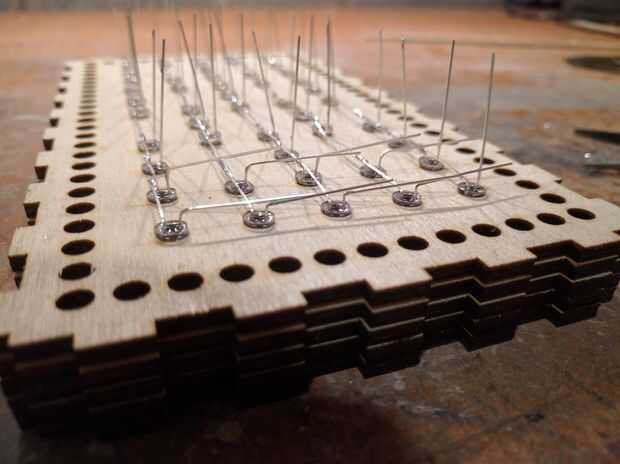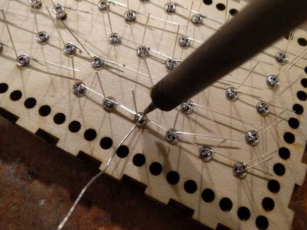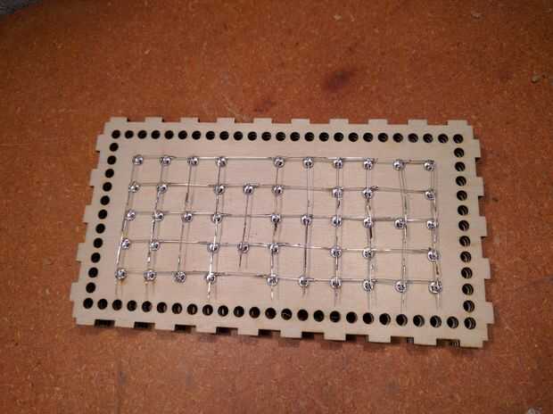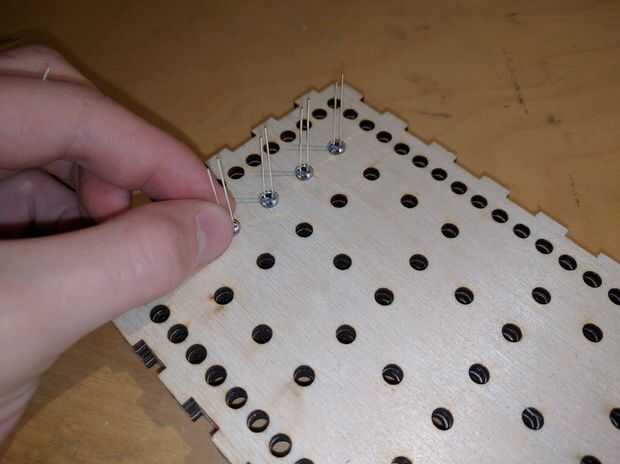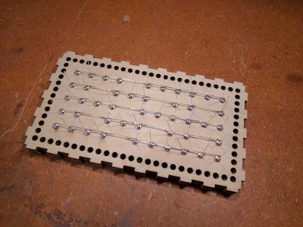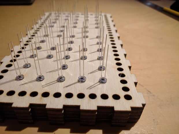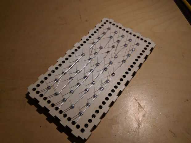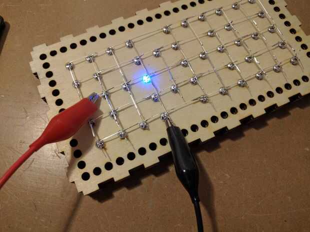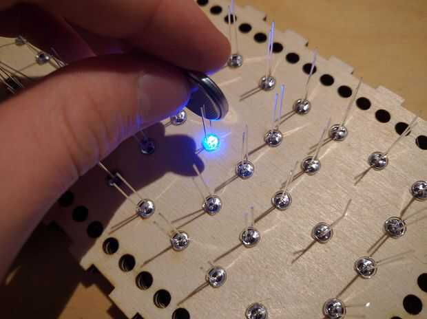 Comience por colocar el azul (o cualquier color usted tiene gusto) LEDs en los agujeros de la placa de cara de tal manera que fácilmente puede soldar el negativo lleva en cada columna y los cables de positivo en cada fila uno al otro. Te darás cuenta de que me decidí a hacer los puntos LED verde; otra vez, esta elección de color es totalmente hasta usted. Antes de soldar, probar cada LED con una pila de botón, para asegurarse de que usted no reciba cualquier LED defectuoso. Entonces curva y soldadura lleva el positivo de cada LED, seguido de la negativa conduce, asegurándose de que hay es un pequeño espacio entre los cables de cada LED para evitar cortocircuitos y positivo. Por último, probar que todo lo ha conectado correctamente con una fuente de alimentación de su elección.