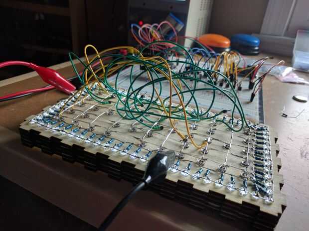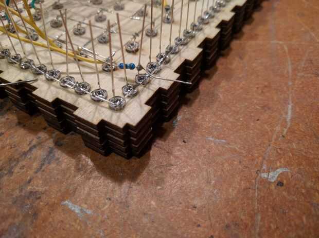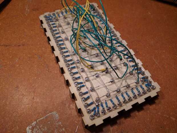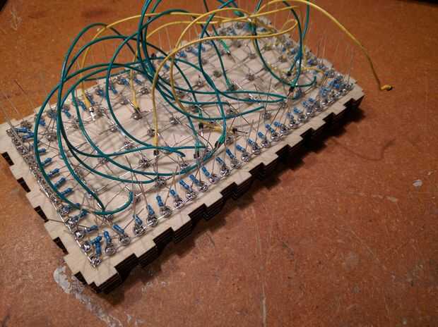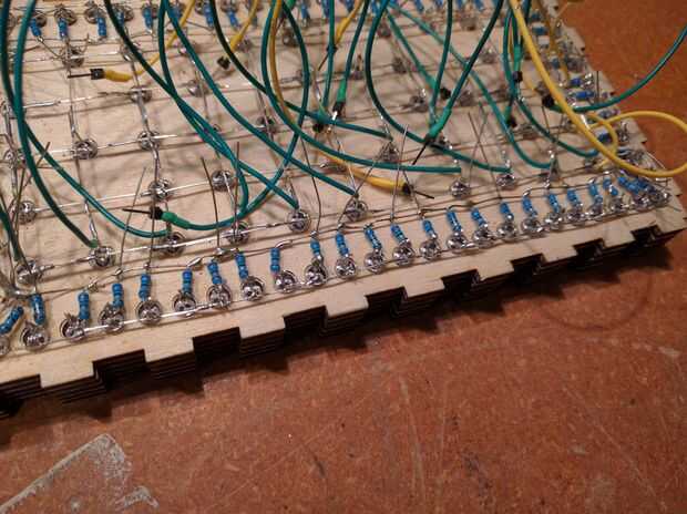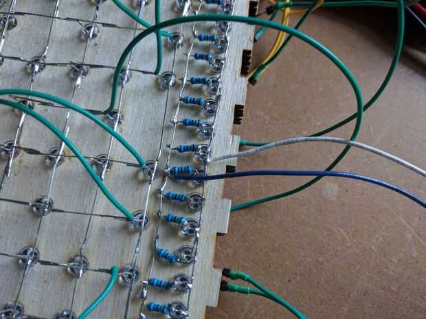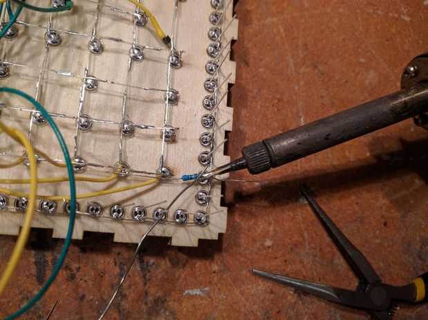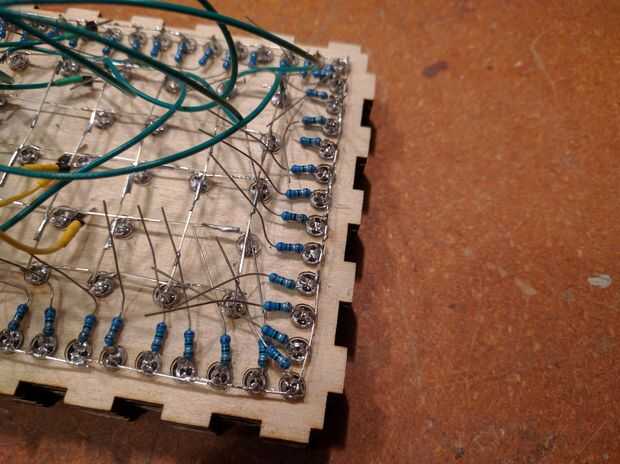 Empezar girando una resistencia alrededor de cada cable negativo. No para apretar demasiado, de modo que todavía puede deslizar hasta la base del plomo y lo de la soldadura. Una vez que cada LED tiene resistencia soldada a él, conecte el otro extremo de las resistencias entre sí, esencialmente creando un "carril" negativo que más tarde se conectarán a los circuitos de control de brillo. Después de probar que todo ha sido conectado correctamente, otro conjunto de cables con cabeceras para los rieles positivos y negativos de la soldadura.