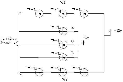 La última foto en este paso da un esquema áspero de la disposición de LED. Como veis, hay 5 líneas controladas por corriente (ambos W! y W2 blanco líneas son entonces PWM controlado por un MOSFET) plus + 5v y + 12v. Es 7 líneas en total, que hay muy bien de un trozo de cable de red de 4 pares.