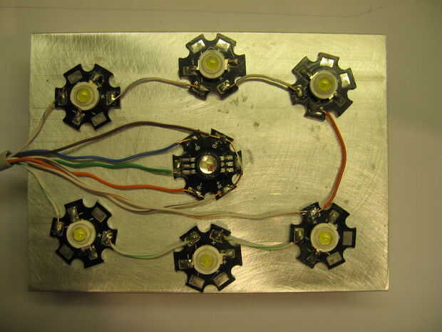 Los LEDs están asegurados para el disipador de calor con pegamento del disipador de calor, que encontré trabajado bien si le pones un punto en un LED y luego frota entre extender muy fino y uniformemente sobre LEDs.