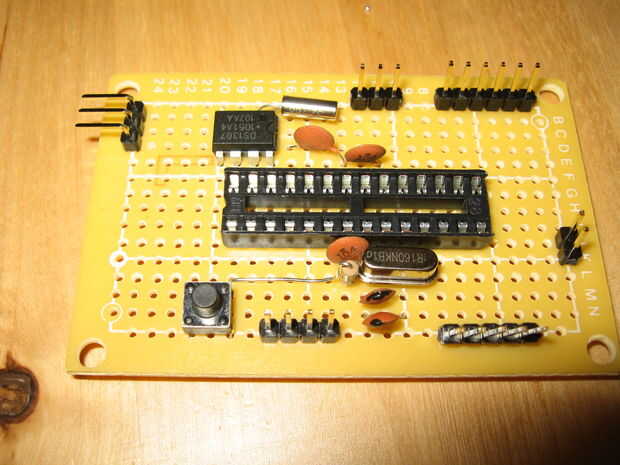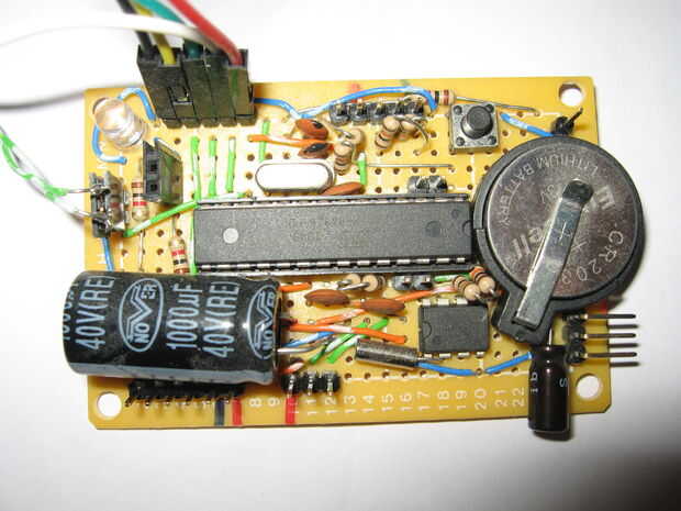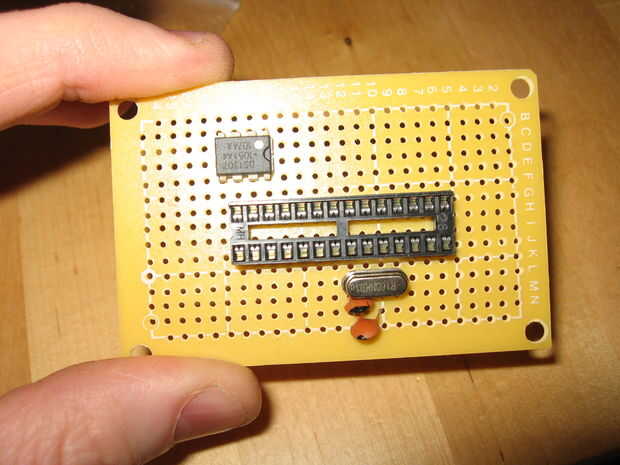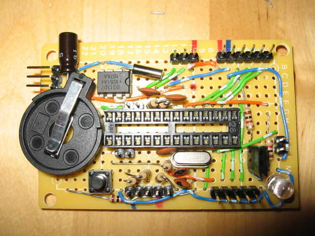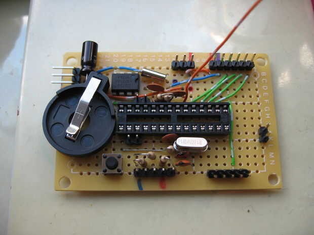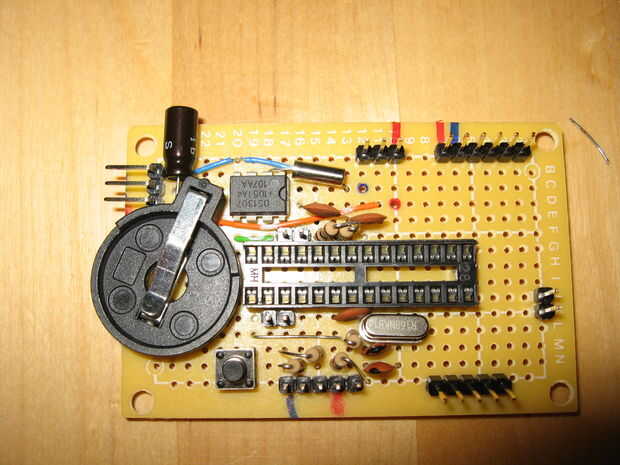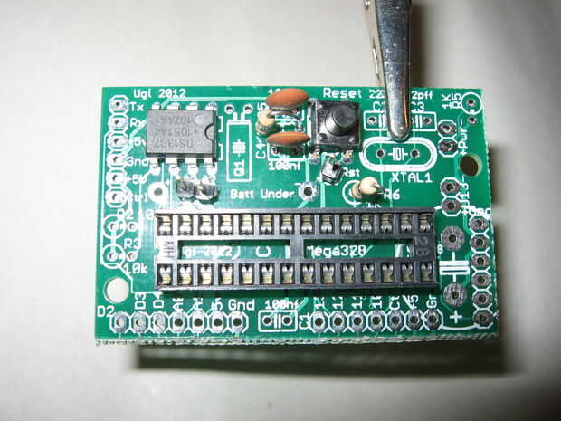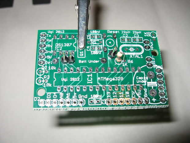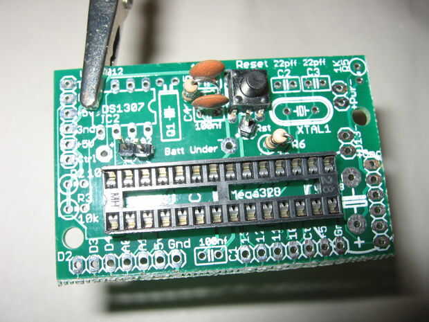 1 - colocar los componentes clave, dejando algo de espacio para los grandes extras como soporte de la batería y ese enorme condensador de uf 1000. El RTC utiliza pines 27 y 28 de los 328 ponga para arriba en esa esquina (verás que está al revés en comparación con los 328).