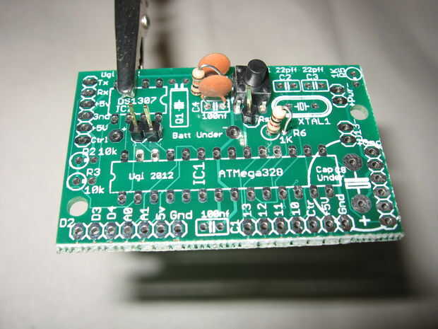 2 - soldadura por todas las partes principales incluyendo las virutas y pasadores de cabecera. Son como muchos de los condensadores principales etc. como cerca de las fichas como sea posible. El cristal de reloj puse en los mismos orificios de pernos 1 y 2 de 1307.