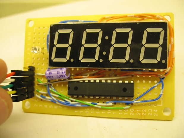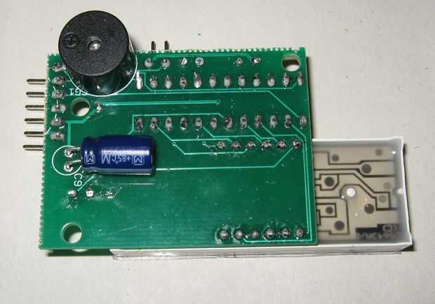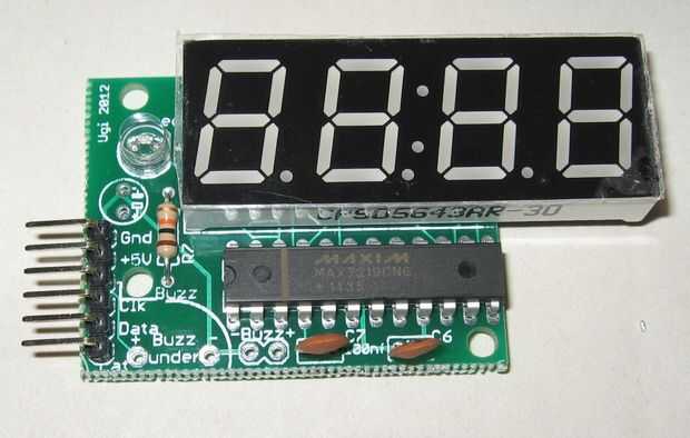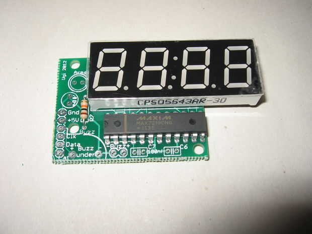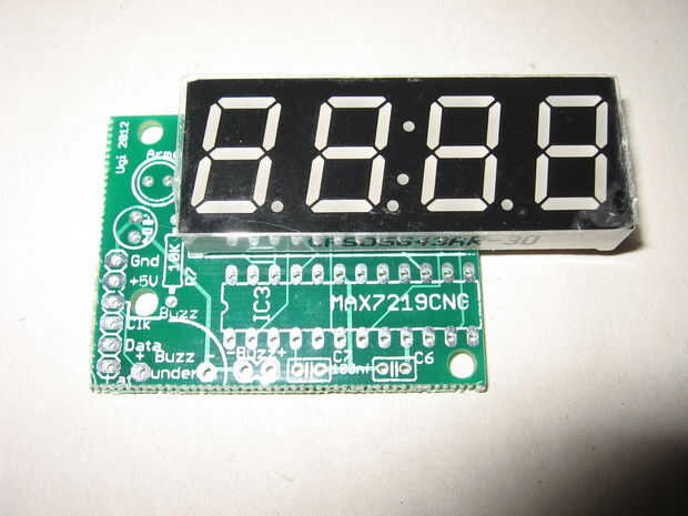 La parte más difícil de este módulo es obtener simplemente los pernos más bien largo y flexibles de la pantalla de LED a través de sus orificios. También necesita hacer las cabeceras de pin antes de la alarma ya que se monta en la espalda, superposición de sus almohadillas de soldadura. Existe un opcional 2 pines si desea montar el timbre fuera del tablero. Soldado en todo pero realmente no necesita el encabezado y el buzer. Hice lo siguiente:
